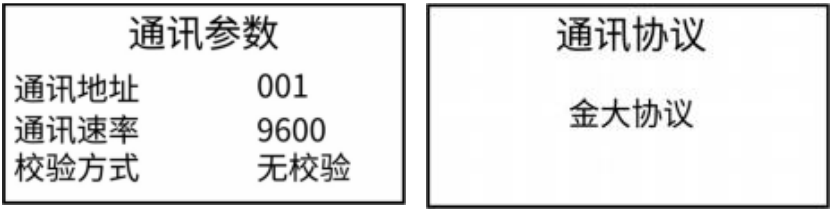 該功能設置控制裝置通訊參數, 以便上位機可與其進行數據通訊,?包含設備通訊地址(1~255)、通訊波特率(2400、4800、9600、19200)、校驗方式(奇校驗、偶校驗、無校驗)?設置。注意:?在同一個 RS485?網絡中設備通訊地址不能重復。用戶按“SET”鍵使相應數值進入修改狀態(tài),?在此狀態(tài)下,?通過